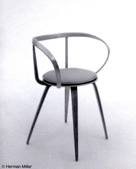 とNGを出してしまうほど。そう、ひとつ目は椅子。あまりに繊細な線でできているため安全性に問題があり、発表後すぐに生産中止になったという、1952年にデザインされた「Pretzel chair(プレッツェル・チェア)」というもの。もとはHerman Millerから出していて、アーム付きは現在Vitra社でヨーロッパ市場向けに復刻版が出ています。でも我が家の「Pretzel」はアーム無し。アームがあるものより派手な印象はなく、とてもさりげない椅子です。