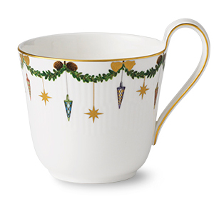Star Fluted Christmasそしてクリスマスシーズンだけに登場するStar Fluted Christmas<スターフルーテッド クリスマス>。2019年はロイヤル コペンハーゲンならではのシェイプ、ハイハンドルマグがシリーズに加わります。古代ローマの温めたオリーブオイルを注ぐツボに着想を得たハイハンドルは、安定性が高く、指が熱い飲み物を入れた器にあたらないため、ホットワインやココアなどでほっとしたい季節にぴったりのシェイプです。もみの木のガーランドにたくさんのプレゼントが飾られた愛らしいこのパターンは1781年に始まり、コレクションは1895年に作られたクリスマスディナーウェアに由来します。クリスマスディナーとプレゼントに沸く現在のようなクリスマスを祝うスタイルは、16~17世紀に60年にわたって善政を敷いたデンマーク国王クリスチャン4世が最初に始めたものと伝えられ、以来デンマークの人にとって常緑の木に輝くオーナメントとプレゼントを飾り、華やかな祝祭の宴をかこむクリスマスは、いつでも安らげる家族と故郷の思い出に戻れる、大切な時となりました。このクリスマスを祝うアイテムは、2019年11月1日より発売されます。
